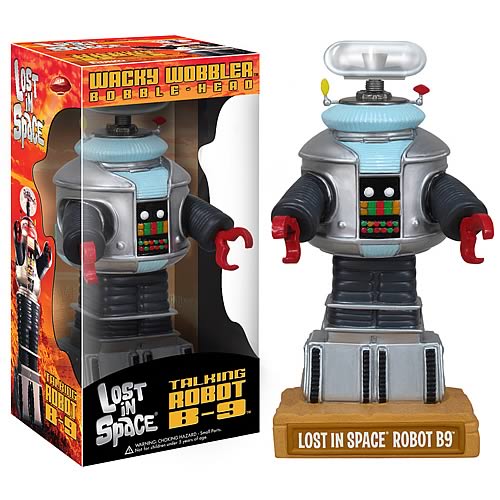 Irwin Allen Fans the Merchadise is here just in time for the Holidays!Lost in Space Talking B-9 Bobble Head - Danger, Danger, Will Robinson! From the classic Irwin Allen science fiction television series, Lost in Space comes the iconic Class YM-3 Model B-9 Robot talking bobble head! Robot B-9 stands approximately 6-inches tall atop his name display base. The B-9 Robot bobble head comes in a window box. With a nod of his head, B-9 utters the following phrases:
